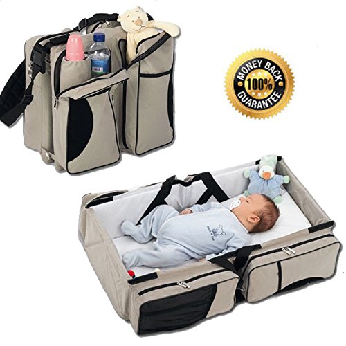 - CHANGE TABLE AND DIAPER BAG - Unzip the end panels to make diaper changing easy on the go! 5 zip compartments for storing diapers, creams, wipes and other baby necessities with 1 insulated bottle cooler included.